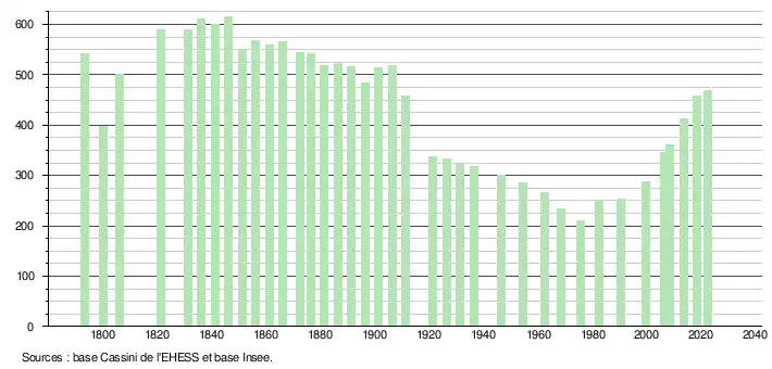 L'évolution du nombre d'habitants est connue à travers les recensements de la population effectués dans la commune depuis 1793. Pour les communes de moins de 10 000 habitants, une enquête de recensement portant sur toute la population est réalisée tous les cinq ans, les populations de référence des années intermédiaires étant quant à elles estimées par interpolation ou extrapolation[26]. Pour la commune, le premier recensement exhaustif entrant dans le cadre du nouveau dispositif a été réalisé en 2008[27].