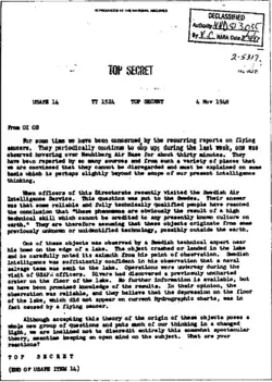- "Depuis un certain temps, nous sommes préoccupés par les rapports récurrents sur les soucoupes volantes. Elles continuent périodiquement à apparaître ; la semaine dernière, l'une d'entre elles a été observée planant au-dessus de la base aérienne de Neubiberg pendant environ trente minutes. Elles ont été signalées par de nombreuses sources et provenant d'une grande variété d'endroits, nous sommes donc convaincus qu'elles ne peuvent pas être ignorées et doivent être expliquées sur une base qui est peut-être légèrement au-delà de la portée de notre pensée actuelle en matière de renseignement.