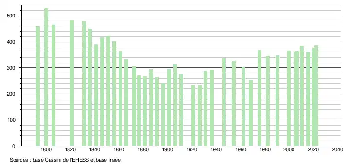 L'évolution du nombre d'habitants est connue à travers les recensements de la population effectués dans la commune depuis 1793. Pour les communes de moins de 10 000 habitants, une enquête de recensement portant sur toute la population est réalisée tous les cinq ans, les populations de référence des années intermédiaires étant quant à elles estimées par interpolation ou extrapolation[18]. Pour la commune, le premier recensement exhaustif entrant dans le cadre du nouveau dispositif a été réalisé en 2005[19].