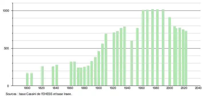 L'évolution du nombre d'habitants est connue à travers les recensements de la population effectués dans la commune depuis 1800. Pour les communes de moins de 10 000 habitants, une enquête de recensement portant sur toute la population est réalisée tous les cinq ans, les populations de référence des années intermédiaires étant quant à elles estimées par interpolation ou extrapolation[19]. Pour la commune, le premier recensement exhaustif entrant dans le cadre du nouveau dispositif a été réalisé en 2008[20].
