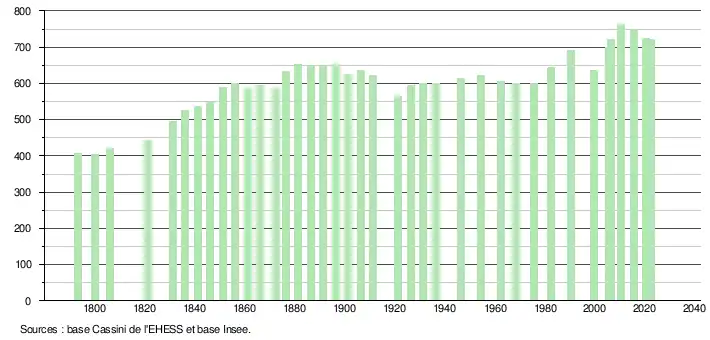 - ↑ Population municipale de référence en vigueur au 1er janvier 2025, millésimée 2022, définie dans les limites territoriales en vigueur au 1er janvier 2024, date de référence statistique : 1er janvier 2022.