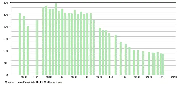 | L'évolution du nombre d'habitants est connue à travers les recensements de la population effectués dans la commune depuis 1793. Pour les communes de moins de 10 000 habitants, une enquête de recensement portant sur toute la population est réalisée tous les cinq ans, les populations de référence des années intermédiaires étant quant à elles estimées par interpolation ou extrapolation[20]. Pour la commune, le premier recensement exhaustif entrant dans le cadre du nouveau dispositif a été réalisé en 2008[21]. En 2022, la commune comptait 175 habitants[Note 2], en évolution de −5,41 % par rapport à 2016 (Corrèze : −0,59 %, France hors Mayotte : +2,11 %). |