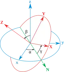 - Une deuxième rotation, la nutation, fait tourner le repère autour de cette direction N, pour abaisser l'axe de rotation z d'un angle β, l'amenant sur sa nouvelle position Z (et déplaçant à nouveau l'axe y).