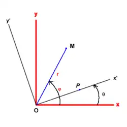 Dans le nouveau repère x'Oy' déduit du précédent par une rotation d'angle θ (voir la figure) les nouvelles coordonnées polaires sont r et (φ - θ) et les coordonnées cartésiennes deviennent