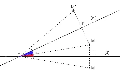 La composée de deux réflexions (ou symétries) s(d) et s(d') d'axes sécants en O est une rotation de centre O. Plus précisément, si