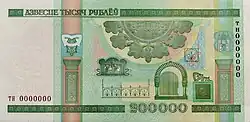 500 Br | 150 mm x 74 mm | Palais de la Culture des Syndicats de Minsk | Sculptures se trouvant sur le fronton du bâtiment | |||