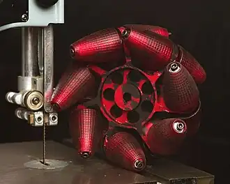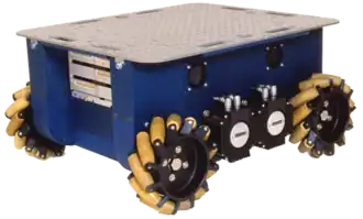 Chaque roue (3[1] minimum) est motorisée, commandée en vitesse chacune indépendamment des autres, en fonction du mouvement à produire. Elles sont placées généralement en position évoquant un rectangle. Les axes principaux de rotation des roues sont parallèles. À la périphérie de chaque roue, de petites roulettes non motorisées (en rotation libre) sont placées à 45°.
