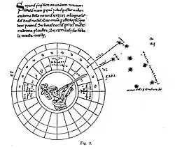- 1299, le majorquin Raymond Lulle[10] décrit l’opération d’une horloge nocturne ou Roue des heures par la Polaire, appelé astrolabii nocturni (connu comme Noturlábio). Il écrit dans son Arbor scientiae en 1295 à propos des marins « habent chartam, compassum, acum et stella maris. » Acus c’est l’aiguille, (autrement dit la boussole) ; stella maris, l'Étoile Polaire et son mouvement la Roue polaire.