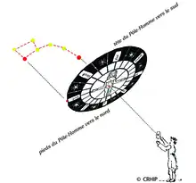 Si on observe le ciel on constate que les étoiles tournent autour du Pôle, de la droite vers la gauche, quand on les observe, face au nord sous nos latitudes. Le Soleil et la Lune tournent, quant à eux, de la gauche vers la droite toujours dans l’hémisphère nord mais on les observe face au sud. Pourtant le mouvement apparent des astres étant dû à la rotation terrestre, les astres tournent d’ un même mouvement dans l’espace, c’est la position de l’observateur qui les fait paraître changer de sens. Il faudrait spécifier chaque fois la position de l’observateur : face au sud ou face au nord ; les explications deviennent alors pénibles. Pour y remédier, on prend pour repère cet homme de la roue pôle-homme, épinglé sur le Pôle Nord céleste et qui regarde donc toujours vers le sud et on parlera de la position d’ un astre en disant qu’ il est dans le bras droit ou bien dans le bras gauche.