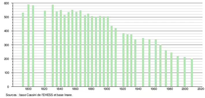 - ↑ Dans le tableau des recensements et le graphique, par convention dans Wikipédia, le principe a été retenu, pour les populations légales postérieures à 1999 de n’afficher dans le tableau des recensements et le graphique que les populations correspondant à l'année 2006, première population légale publiée calculée conformément aux concepts définis dans le décret no 2003-485 du 5 juin 2003, et les années correspondant à une enquête exhaustive de recensement pour les communes de moins de 10 000 habitants, ainsi que la dernière population légale publiée par l’Insee.