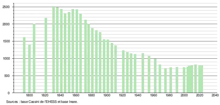 L'évolution du nombre d'habitants est connue à travers les recensements de la population effectués dans la commune depuis 1793. Pour les communes de moins de 10 000 habitants, une enquête de recensement portant sur toute la population est réalisée tous les cinq ans, les populations de référence des années intermédiaires étant quant à elles estimées par interpolation ou extrapolation[17]. Pour la commune, le premier recensement exhaustif entrant dans le cadre du nouveau dispositif a été réalisé en 2004[18].