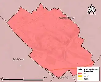 Le retrait-gonflement des sols argileux est susceptible d'engendrer des dommages importants aux bâtiments en cas d’alternance de périodes de sécheresse et de pluie. La totalité de la commune est en aléa moyen ou fort (88,8 % au niveau départemental et 48,5 % au niveau national). Sur les 700 bâtiments dénombrés sur la commune en 2019, 700 sont en aléa moyen ou fort, soit 100 %, à comparer aux 98 % au niveau départemental et 54 % au niveau national. Une cartographie de l'exposition du territoire national au retrait gonflement des sols argileux est disponible sur le site du BRGM[20],[Carte 3].