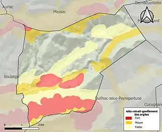 Le retrait-gonflement des sols argileux est susceptible d'engendrer des dommages importants aux bâtiments en cas d’alternance de périodes de sécheresse et de pluie. 34,4% de la superficie communale est en aléa moyen ou fort (75,2% au niveau départemental et 48,5% au niveau national). Sur les 93 bâtiments dénombrés sur la commune en 2019, 76 sont en aléa moyen ou fort, soit 82%, à comparer aux 94% au niveau départemental et 54% au niveau national. Une cartographie de l'exposition du territoire national au retrait gonflement des sols argileux est disponible sur le site du BRGM[28],[Carte 3].