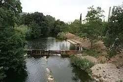 Le château de Peyrepertuse vu depuis la place du villageLa rivière "Verdouble" alimente un petit plan d'eau près du villageNotes