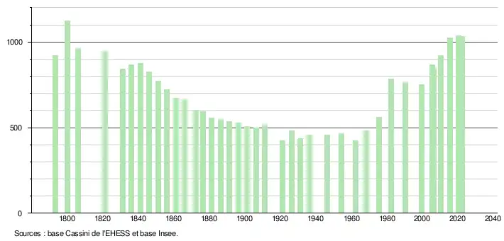 L'évolution du nombre d'habitants est connue à travers les recensements de la population effectués dans la commune depuis 1793. Pour les communes de moins de 10 000 habitants, une enquête de recensement portant sur toute la population est réalisée tous les cinq ans, les populations de référence des années intermédiaires étant quant à elles estimées par interpolation ou extrapolation[37]. Pour la commune, le premier recensement exhaustif entrant dans le cadre du nouveau dispositif a été réalisé en 2005[38].