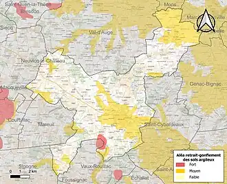 Le retrait-gonflement des sols argileux est susceptible d'engendrer des dommages importants aux bâtiments en cas d’alternance de périodes de sécheresse et de pluie. 27,7 % de la superficie communale est en aléa moyen ou fort (67,4 % au niveau départemental et 48,5 % au niveau national). Sur les 1 466 bâtiments dénombrés sur la commune en 2019, 859 sont en aléa moyen ou fort, soit 59 %, à comparer aux 81 % au niveau départemental et 54 % au niveau national. Une cartographie de l'exposition du territoire national au retrait gonflement des sols argileux est disponible sur le site du BRGM[15],[16].