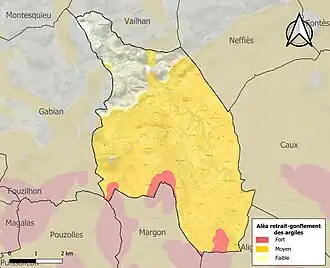 Le retrait-gonflement des sols argileux est susceptible d'engendrer des dommages importants aux bâtiments en cas d’alternance de périodes de sécheresse et de pluie. 81,6 % de la superficie communale est en aléa moyen ou fort (59,3 % au niveau départemental et 48,5 % au niveau national). Sur les 1 186 bâtiments dénombrés sur le territoire de la commune en 2019, 1 177 sont en aléa moyen ou fort, soit 99 %, à comparer aux 85 % au niveau départemental et 54 % au niveau national. Une cartographie de l'exposition du territoire national au retrait gonflement des sols argileux est disponible sur le site du BRGM[13],[Carte 2].