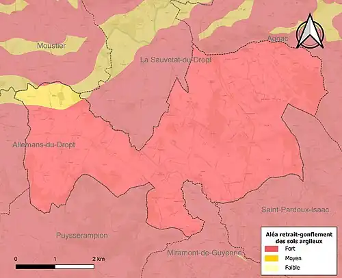 Le retrait-gonflement des sols argileux est susceptible d'engendrer des dommages importants aux bâtiments en cas d’alternance de périodes de sécheresse et de pluie[19]. La totalité de la commune est en aléa moyen ou fort (91,8 % au niveau départemental et 48,5 % au niveau national)[Carte 2]. Depuis le , en application de la loi ELAN, différentes contraintes s'imposent aux vendeurs, maîtres d'ouvrages ou constructeurs de biens situés dans une zone classée en aléa moyen ou fort[Note 4],[20].