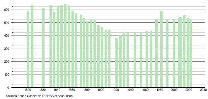 L'évolution du nombre d'habitants est connue à travers les recensements de la population effectués dans la commune depuis 1800. Pour les communes de moins de 10 000 habitants, une enquête de recensement portant sur toute la population est réalisée tous les cinq ans, les populations de référence des années intermédiaires étant quant à elles estimées par interpolation ou extrapolation[24]. Pour la commune, le premier recensement exhaustif entrant dans le cadre du nouveau dispositif a été réalisé en 2008[25].