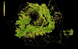 Les Carpates, le Danube et la mer Noire sont les structures majeures de la géographie physique. La Roumanie est à la 79e place mondiale et à la douzième du continent européen par son territoire de 237 499 km2 terrestres et 39 940 aquatiques dont 892 lacustres, 8 947 d'eaux territoriales et contiguës en mer Noire (soit un total de 247 338 sous souveraineté) et 30 100 de zone économique exclusive. Ce territoire, dont 120 345 km2 proviennent de la Roumanie d'avant 1913 (120 732 km2) et 117 154 km2 de l'Empire austro-hongrois (676 615 km2), a souvent varié dans le temps. Sur leur flanc oriental, les États formant l'actuelle Roumanie ont subi, de la fin du XVIIIe siècle jusqu'à la seconde moitié du XXe siècle, la pression de l'Empire russe puis de l'URSS et de ses États-successeurs : de cette pression découle une controverse identitaire concernant les Moldaves et un litige territorial et maritime avec l'Ukraine. Concernant l'extrémité orientale de leur frontière commune, c'est la Cour internationale de justice de La Haye qui, le , a départagé la Roumanie et l'Ukraine dans le conflit qui les opposait autour du bras danubien de Chilia et du plateau continental maritime : il s'agit de territoires occupés par l'URSS en 1948, après le traité de paix de Paris de 1947. Le jugement de la cour n'a accordé à l'Ukraine que 2 500 km2 des 12 000 km2 de plateau continental que ce pays revendiquait, mais c'est la partie la moins profonde (la plus facilement exploitable) et, de plus, il a confirmé le traité frontalier bilatéral de 1997 abandonnant à l'Ukraine toutes les îles en litige, dont l'île des Serpents[11]. Ainsi, à l'exception de la décolonisation occidentale, la Roumanie est un des rares pays européens à avoir perdu des territoires après les traités de paix consécutifs à la Seconde Guerre mondiale.