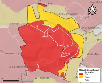 Les mouvements de terrains susceptibles de se produire sur la commune sont soit des chutes de blocs, soit des glissements de terrains, soit des effondrements liés à des cavités souterraines, soit des mouvements liés au retrait-gonflement des argiles. Près de 50 % de la superficie du département est concernée par l'aléa retrait-gonflement des argiles, dont la commune de Roumengoux[39]. L'inventaire national des cavités souterraines permet par ailleurs de localiser celles situées sur la commune[40].