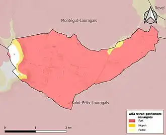 Le retrait-gonflement des sols argileux est susceptible d'engendrer des dommages importants aux bâtiments en cas d’alternance de périodes de sécheresse et de pluie. 96,9 % de la superficie communale est en aléa moyen ou fort (88,8 % au niveau départemental et 48,5 % au niveau national). Sur les 111 bâtiments dénombrés sur la commune en 2019, 111 sont en aléa moyen ou fort, soit 100 %, à comparer aux 98 % au niveau départemental et 54 % au niveau national. Une cartographie de l'exposition du territoire national au retrait gonflement des sols argileux est disponible sur le site du BRGM[21],[Carte 3].