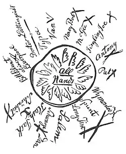 Dans les milieux marins, la pratique est attestée dès le début du XVIIe siècle. Dans une lettre datable du début du règne de Charles Ier d'Angleterre (r. 1625-1649), probablement de 1627 (la lettre se trouvant conservée au sein du Calendar of State Papers de cette année dans les fonds des National Archives britanniques[11]), 76 marins réclament à leur capitaine la perception de leur solde, l'approvisionnement de leur navire et la réparation des cordages, à défaut de quoi ils refusent de lever l'ancre. Le manifeste, au centre, est composé de 12 vers, où ils opposent les promesses du capitaine à la protection du roi et de Dieu, et où ils se conjurent d'appliquer l'adage populaire : "avant de céder, nous mourrons, un pour tous, et tous pour un" ("before we yield we, one and all, will die"). Le texte de revendication est entouré de deux cercles. Les noms et prénoms des souscripteurs sont écrits en rayon, à l'intérieur du cercle le plus proche du texte.