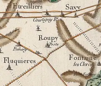 Sur la Carte de Cassini ci-contre, Roupy, vers 1750, était une paroisse située sur la route empierrée allant de Saint-Quentin à Ham.
