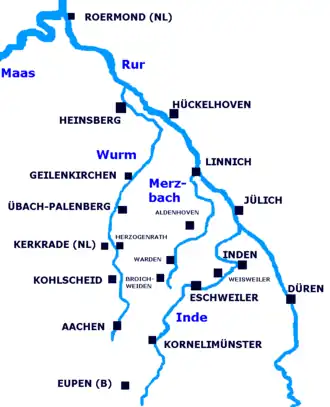 La rivière a deux affluents d'importance sur le territoire belge : le Schwartzbach (hauteurs de Sourbrodt) et la Schwalm (région de Rocherath et Elsenborn, également connue sous le nom de Schwalmbach et de Perlenbach). Les affluents importants en Allemagne sont la Wurm à Heinsberg, l'Inde à Jülich et l'Urft à Rurberg.