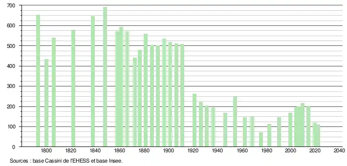 - ↑ Fiches Insee - Populations de référence de la commune pour les années 2006, 2007, 2008, 2009, 2010, 2011, 2012, 2013, 2014, 2015, 2016, 2017, 2018, 2019, 2020, 2021 et 2022.