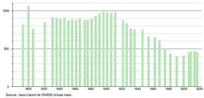 L'évolution du nombre d'habitants est connue à travers les recensements de la population effectués dans la commune depuis 1793. Pour les communes de moins de 10 000 habitants, une enquête de recensement portant sur toute la population est réalisée tous les cinq ans, les populations de référence des années intermédiaires étant quant à elles estimées par interpolation ou extrapolation[4]. Pour la commune, le premier recensement exhaustif entrant dans le cadre du nouveau dispositif a été réalisé en 2008[5].