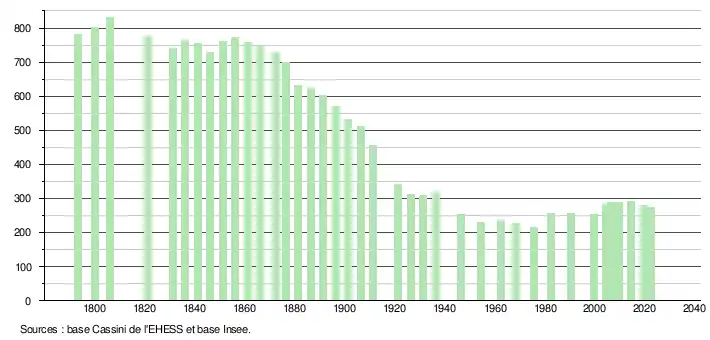 L'évolution du nombre d'habitants est connue à travers les recensements de la population effectués dans la commune depuis 1793. Pour les communes de moins de 10 000 habitants, une enquête de recensement portant sur toute la population est réalisée tous les cinq ans, les populations de référence des années intermédiaires étant quant à elles estimées par interpolation ou extrapolation[17]. Pour la commune, le premier recensement exhaustif entrant dans le cadre du nouveau dispositif a été réalisé en 2004[18].