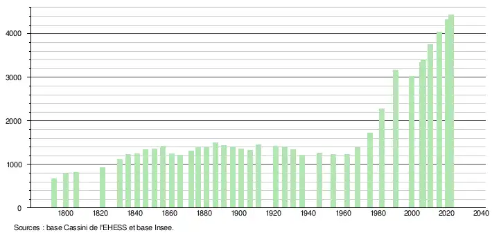 L'évolution du nombre d'habitants est connue à travers les recensements de la population effectués dans la commune depuis 1793. Pour les communes de moins de 10 000 habitants, une enquête de recensement portant sur toute la population est réalisée tous les cinq ans, les populations de référence des années intermédiaires étant quant à elles estimées par interpolation ou extrapolation[26]. Pour la commune, le premier recensement exhaustif entrant dans le cadre du nouveau dispositif a été réalisé en 2005[27].