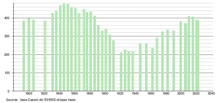 L'évolution du nombre d'habitants est connue à travers les recensements de la population effectués dans la commune depuis 1793. Pour les communes de moins de 10 000 habitants, une enquête de recensement portant sur toute la population est réalisée tous les cinq ans, les populations de référence des années intermédiaires étant quant à elles estimées par interpolation ou extrapolation[16]. Pour la commune, le premier recensement exhaustif entrant dans le cadre du nouveau dispositif a été réalisé en 2005[17].