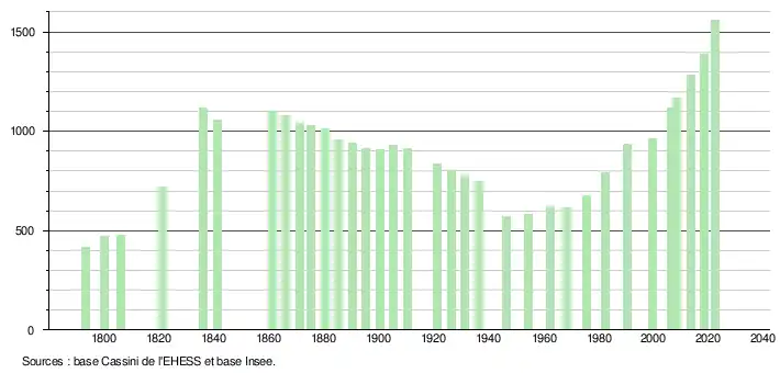 L'évolution du nombre d'habitants est connue à travers les recensements de la population effectués dans la commune depuis 1793. Pour les communes de moins de 10 000 habitants, une enquête de recensement portant sur toute la population est réalisée tous les cinq ans, les populations de référence des années intermédiaires étant quant à elles estimées par interpolation ou extrapolation[20]. Pour la commune, le premier recensement exhaustif entrant dans le cadre du nouveau dispositif a été réalisé en 2008[21].