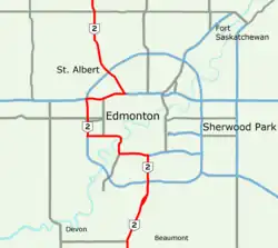 Cinq routes différentes sont empruntées par la route 2 dans les villes d'Edmonton et de Saint-Albert. Au sud d'Edmonton, la route s'élargit à cinq voies par direction. Après avoir croisé la route 216 et 23 Avenue NW, les voies se séparent et la chaussé nord devient Gateway Boulevard alors que la chaussée sud devient Calgary Trail. La route rencontre alors la route 14, laquelle prend fin, et la route 2 poursuit le trajet de celle-ci vers l'ouest sur Whitemud Drive.