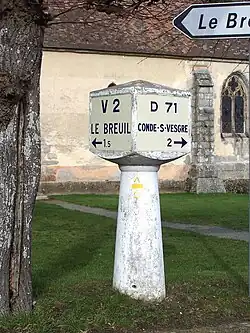 - Condé-sur-Vesgre : au carrefour central du village, la route départementale 983 a un tracé à angle droit, en ce sens qu'elle constitue les rues nord et ouest dudit carrefour, et, tandis que la rue vers l'ouest mène à la route départementale 936, la rue vers le sud, appelée rue de la Vesgre, est la D71 ; à seulement 200 mètres dudit carrefour, la route départementale 63 commence qui rejoint, en direction du sud-est, la D936 dans le hameau du Hallier ;