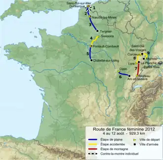 La Route de France féminine 2012 est la sixième édition de la Route de France féminine, course cycliste par étapes disputée en France. Elle est organisée par l'Organisation Routes et Cycles (ORC). Elle s'est élancée de Saint-Pol-sur-Mer, dans le département du Nord, le samedi pour rallier après près de 930 kilomètres de course et 9 étapes la ville de Munster dans le Haut-Rhin le dimanche .