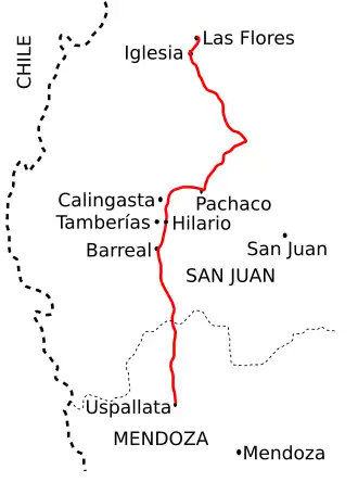 - Département de Calingasta : Barreal (km 114), Ruines d'Hilario (km 135) et Calingasta (km 151).