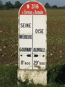 À l'origine, la RN 316 reliait Aumale (dans la vallée de la Bresle) à Caër (près d'Évreux). Elle a été déclassée en RD 316 dans l'Oise et dans l'Eure et en RD 916 en Seine-Maritime.