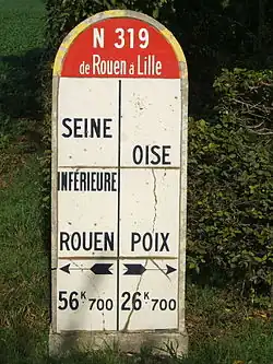 Avant la réforme de 1972, la RN 319 reliait le Moulin d'Écalles (communes de La Rue-Saint-Pierre et de Vieux-Manoir) à Formerie, Abancourt à Poix-de-Picardie, Amiens à Arras et Saint-Laurent-Blangy à Carvin, reliant donc les régions rouennaises et lilloises. Elle a été déclassée en RD 919.