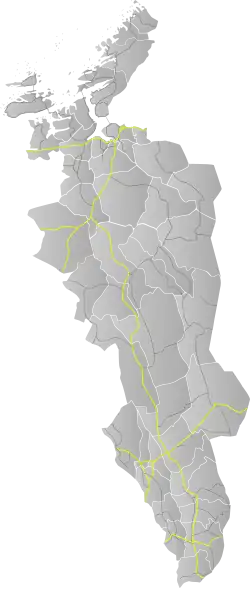 La route part vers le sud de la route européenne 6 à Ulsberg dans la commune de Rennebu du comté de Trøndelag, puis elle traverse Tynset (en) et Elverum (en), elle s'étend jusqu'à Stange dans le comté d'Innlandet, où elle rejoint la route européenne 6. La route à une longueur de 291,3 kilomètres, dont 277,9 kilomètres dans le comté d'Innlandet et 13,4 kilomètres dans le comté de Trøndelag[3]. Le tronçon entre Tønset dans la commune de Løten et Åkroken dans la commune d'Elverum est partagé avec la route nationale 25.