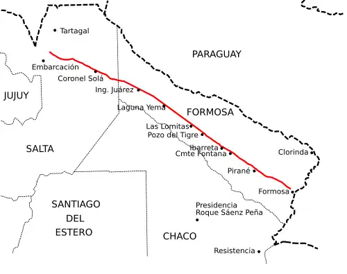 Elle unit ainsi la route nationale 11 aux environs de la ville de Formosa sur la rive droite du río Paraguay avec la route nationale 34 au village d'El Cruce, entre les localités d'Embarcación et de General Ballivián.