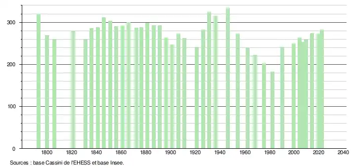 L'évolution du nombre d'habitants est connue à travers les recensements de la population effectués dans la commune depuis 1793. Pour les communes de moins de 10 000 habitants, une enquête de recensement portant sur toute la population est réalisée tous les cinq ans, les populations de référence des années intermédiaires étant quant à elles estimées par interpolation ou extrapolation[21]. Pour la commune, le premier recensement exhaustif entrant dans le cadre du nouveau dispositif a été réalisé en 2004[22].