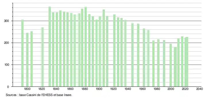 L'évolution du nombre d'habitants est connue à travers les recensements de la population effectués dans la commune depuis 1793. Pour les communes de moins de 10 000 habitants, une enquête de recensement portant sur toute la population est réalisée tous les cinq ans, les populations de référence des années intermédiaires étant quant à elles estimées par interpolation ou extrapolation[36]. Pour la commune, le premier recensement exhaustif entrant dans le cadre du nouveau dispositif a été réalisé en 2005[37].