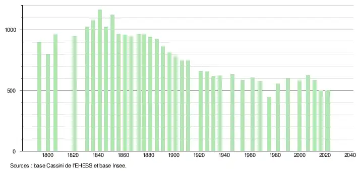 L'évolution du nombre d'habitants est connue à travers les recensements de la population effectués dans la commune depuis 1793. Pour les communes de moins de 10 000 habitants, une enquête de recensement portant sur toute la population est réalisée tous les cinq ans, les populations de référence des années intermédiaires étant quant à elles estimées par interpolation ou extrapolation[12]. Pour la commune, le premier recensement exhaustif entrant dans le cadre du nouveau dispositif a été réalisé en 2006[13].