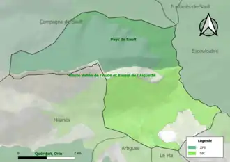 - « l'Aude et son affluent la Bruyante » (37 ha), couvrant 6 communes dont 4 dans l'Ariège et 2 dans l'Aude[31] ;