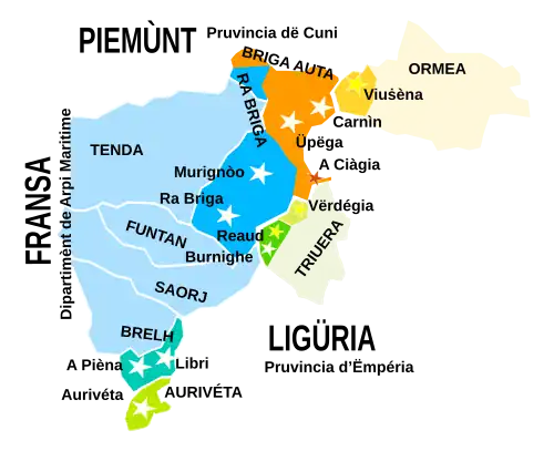 - Dans la province de Coni : Viozene (commune d'Ormea), Briga Alta (partie de l'ancienne commune de Briga Marittima, hameaux d'Upega, Carnino et chef-lieu de Piaggia).
