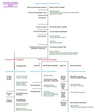 - Link réussit à vaincre Ganon : la princesse Zelda renvoie le Héros du Temps à l'époque de son enfance, sept ans auparavant, pour qu'il dénonce Ganon et annule son règne à venir. Ganondorf est jugé pour ses crimes mais parvient à s'extraire de ses chaînes, il se rend dans un lieu crépusculaire dont il va devenir le maître et emporte avec lui l'arme puissante qui était censée le mettre à mort. C'est la chronologie de Link enfant.