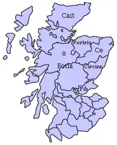 Après la période romaine, un certain nombre de royaumes pictes se sont formés dans l'est de l'Écosse. Le royaume de Circind, qui était encore divisé en royaumes de Fotla (Atholl), Fib (Fife) et Circind (comté d'Angus), bordait le royaume de Ce au sud. À l'ouest, autour de l'actuelle ville d'Inverness, aurait pu être le royaume de Fidach. Dans l'extrême nord et les îles du Nord se trouvait le royaume de Cat, qui a donné plus tard le nom au comté de Caithness[4].
